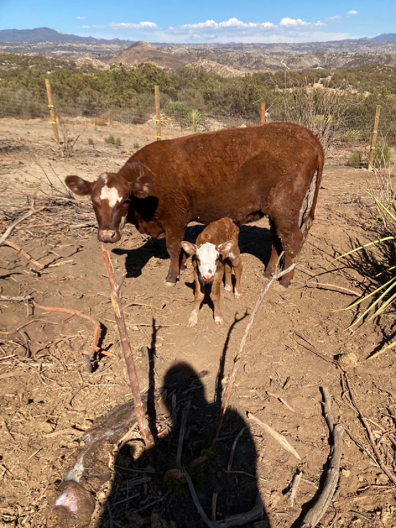Carnation the Red Baldy Cow in the pasture with her calf