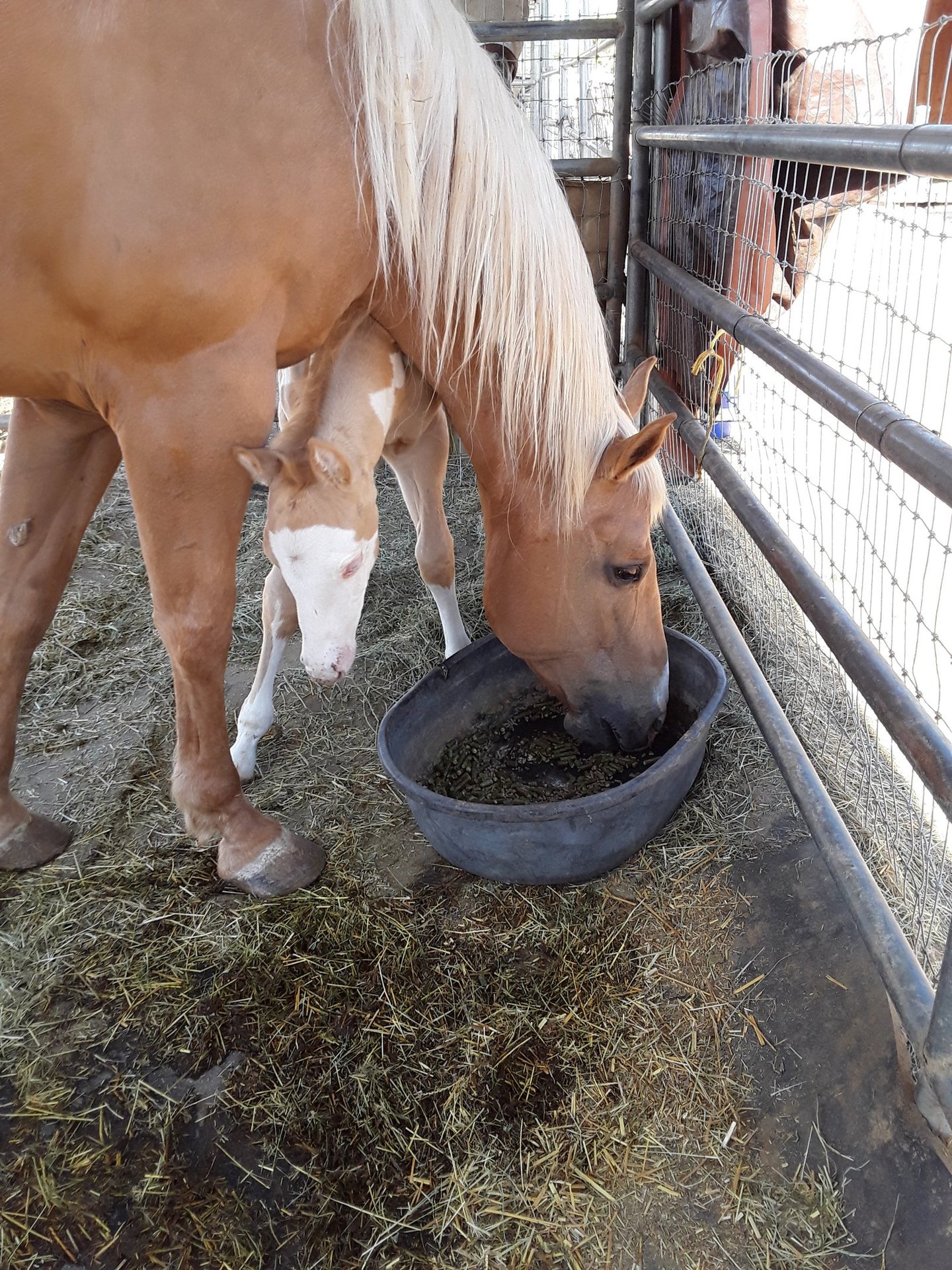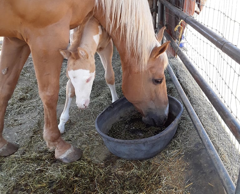 Sequoia, an AQHA horse & Colt Having breakfast