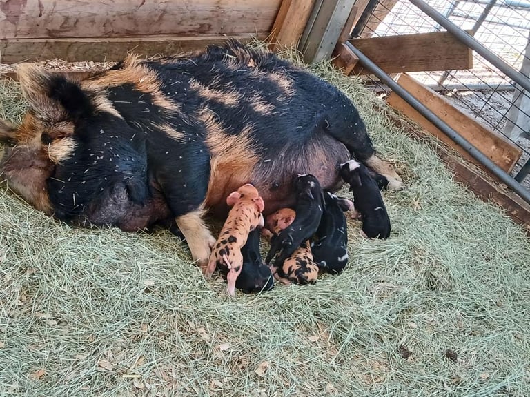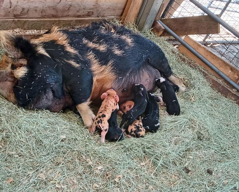 Hazel the Kunekune Pig feeding her piglets